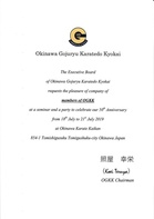 Okinawa Goju-ryu Karate-do Kyokain (OGKK) 50-vuotisjuhlaleiri järjestettiin Okinawalla 18. - 22.7.2019. Leirin opettajina toimivat muun muassa seuraavat senseit: Koei Teruya 10. dan, Masanari Kikugawa 9. dan, Ryoichi Onaga 9. dan, Masataka Muramatsu 9. dan, Gensei Koki 9. dan, Tadashi Matayoshi 9. dan ja Yusho Okuma 9. dan. Osallistujilla oli myös mahdollisuus harjoitella paikallisilla saleilla leiriä ennen ja sen jälkeen. Suomalaiset osanottajat kävivät harjoittelemassa sensei Koei Teruyan Kenshukan-dojolla ja sensei Masanari Kikugawan dojolla. Suomesta leirille osallistuivat Jouni Hirsimäki, Matti Saarinen, Kari Kotilainen ja Tiina Toivanen. Liitteet