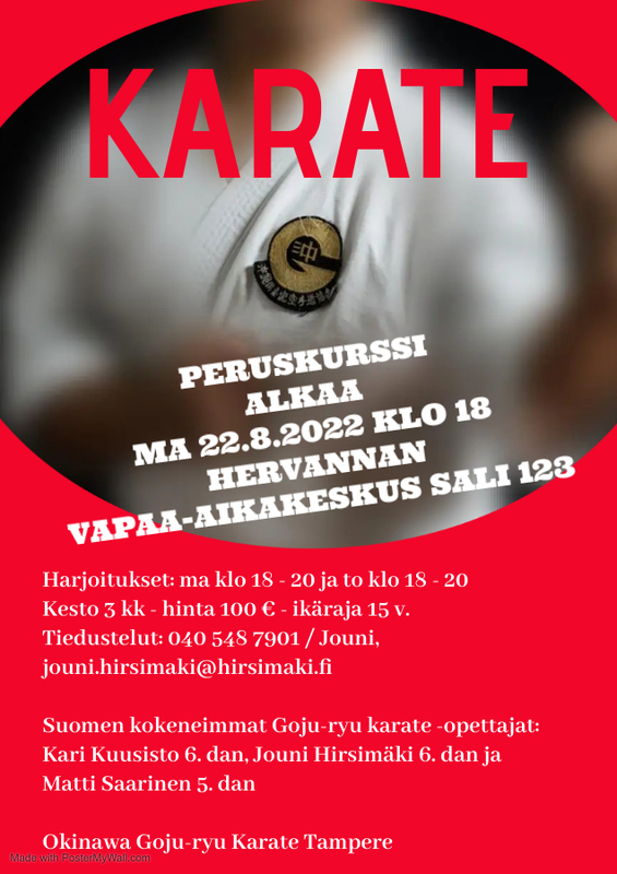 Uusi peruskurssi alkaa maanantaina 22.8.2022 kello 18. Paikkana on Hervannan vapaa-aikakeskuksen sali 123. Harjoitukset ovat maanantaisin kello 18 - 20 ja torstaisin kello 18 - 20. Kurssin kesto on n. 3 kuukautta ja hinta 100 euroa. Alaikäraja on 15 vuotta. Alussa varusteiksi riittävät esim. t-paita ja collegehousut/shortsit. TULE PAIKALLE 10 MIN. ENNEN ENSIMMÄISTEN HARJOITUSTEN ALKUA. |