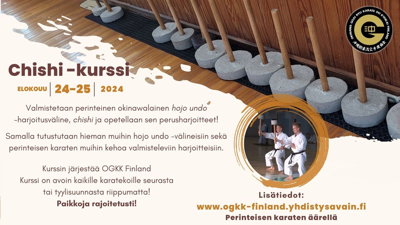 Tammelassa järjestettiin chishi-kurssi 24.-25.8.2024. Kurssilla valmistettiin perinteinen okinawalainen hojo undo -harjoitusväline chishi ja opeteltiin sen harjoittelun perusteita. Kurssilla harjoiteltiin myös Gojuryu-karatelle tyypillisiä junbi undo -liikkeitä, jotka valmistelevat kehon varsinaiseen harjoitteluun. Kurssi oli avoin kaikille karaten harrastajille seurasta ja tyylisuunnasta riippumatta. Kurssin opettajina toimivat senseit Jouni Hirsimäki 6. dan ja Matti Saarinen 5. dan. Liitteet